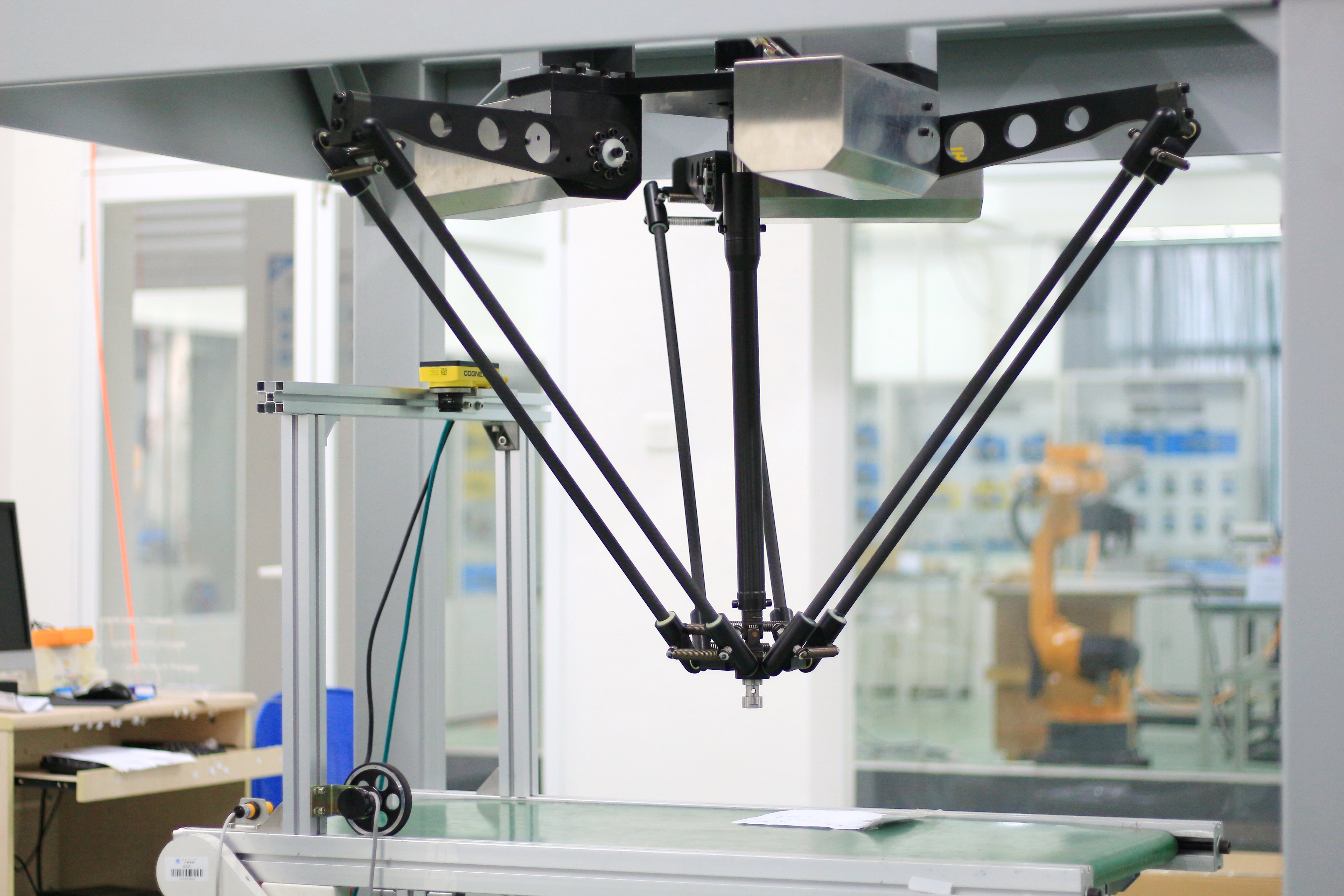 如图1所示,为学生参观众创空间的ABB机器人;如图2所示,为校企联合研制的并联蜘蛛手机器人;图3所示,为安川工业机器人及API项目调试的实验室现场;图4所示,为那智工业机器人实训设备。