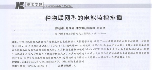 陈锐彬同学受南京沁恒微电子股份有限公司和单片机与嵌入式系统应用期刊(中国科技核心)联合邀稿,在《单片机与嵌入式系统应用》期刊发表《一种物联网型的电能监控排插》论文。