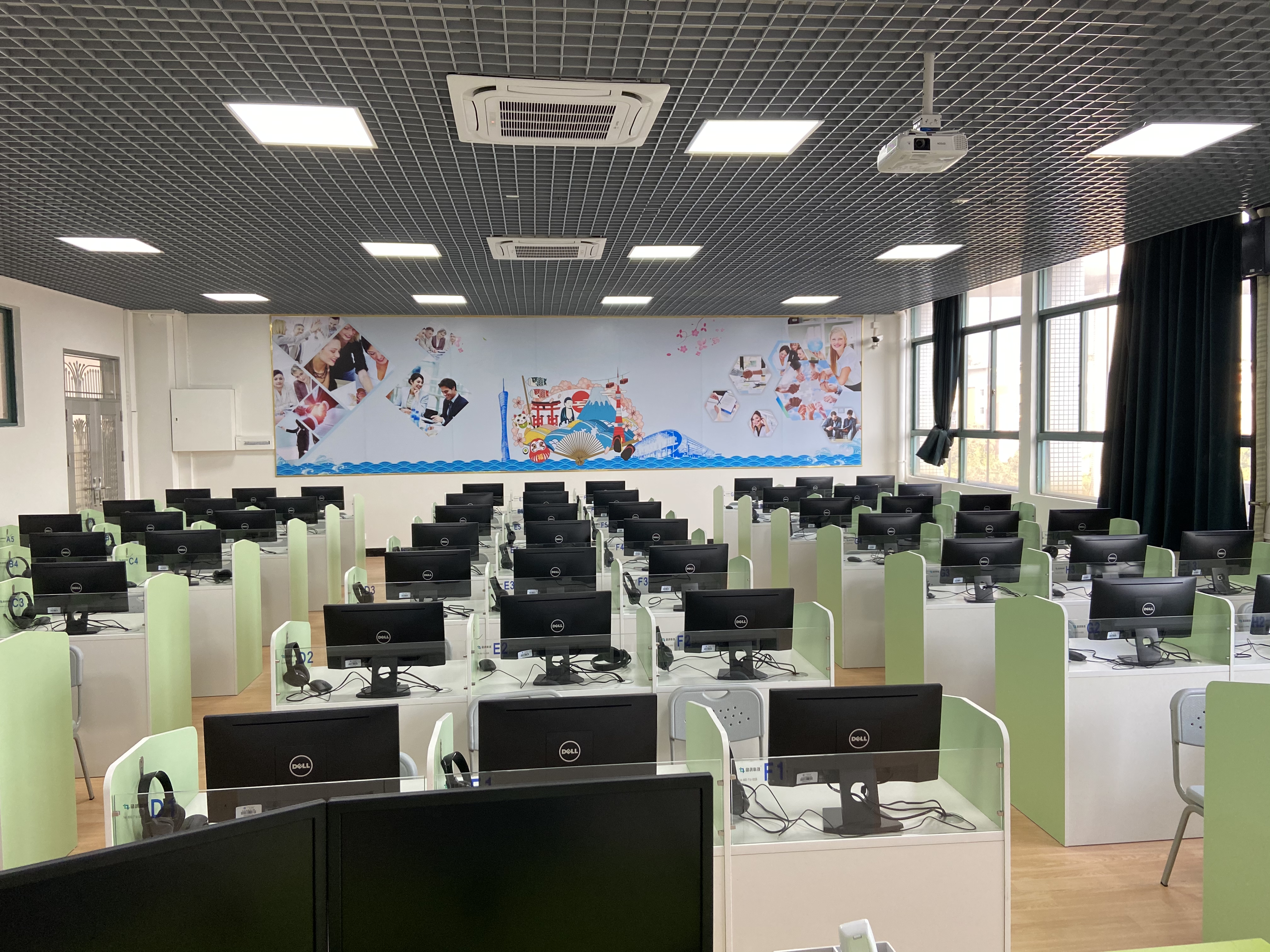 语言教学实验中心建筑面积1500多平方米,实验设备共计3247件,总价值约985万(室内装修除外)。共有学生座位695个,其中学生电脑座位645个,学生平板电脑50台,可同时容纳12个班695名学生进行学习。教师可以利用实验室内的蓝鸽语言教学系统、云桌面系统和商务外语创新实践云中心平台(包括国际贸易实践教学平台、商务英语虚拟仿真实践教学平台、国际商务谈判实践教学平台、商务单证实践教学平台、跨境电商实践教学平台(eBay实战教学平台)、商务日语实践教学平台)等,对学生进行因材施教,提高学生学习积极性,培养学生利用实验室的教学资源,进行口语、听力、口译等多方面的自主学习,培养学生具有外语实际应用能力,提高专业技能,培养应用型人才。