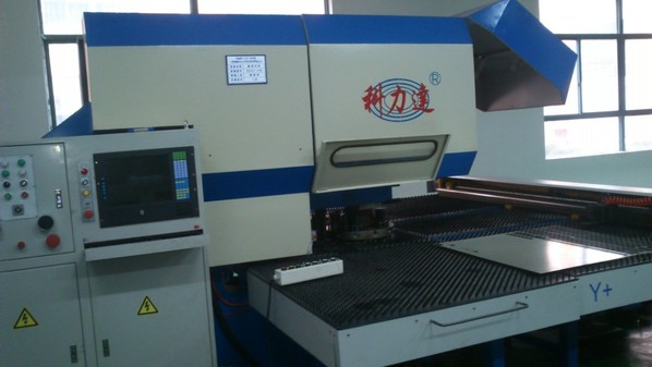 数控冲床是用来对金属薄板进行冲裁或者成型的一种自动化生产机器,由数控系统与普通冲床联合而成的。通过控制程序,可以实现板料的自动进给、冲压,最大限度的利用原材料,提高生产率;能高精度地加工各种复杂图形;同时还实现了人工离机操作,确保了劳动安全。全自动的数控冲床包含有很多简单形状的模具,这些模具通常安装在一个转塔上,由数控系统控制,所以也叫数控转塔冲床(CNC Turret Punch Press,简称NCT)。冲压过程中,数控系统控制板料和转塔,完成一个冲压过程,一分钟可冲数百次到上千次。数控冲床广泛用于多品种的板材加工行业,如高低压电力开关成套设备、通讯电子、计算机、电梯、空调、厨具、建筑幕墙装饰、五金家具、电气控制箱、机械外罩加工等。因而数控冲床又被称为“钣金加工中心”。