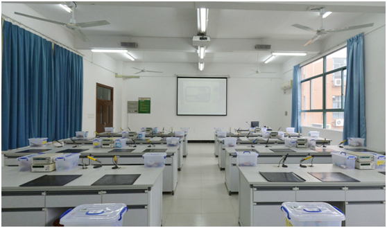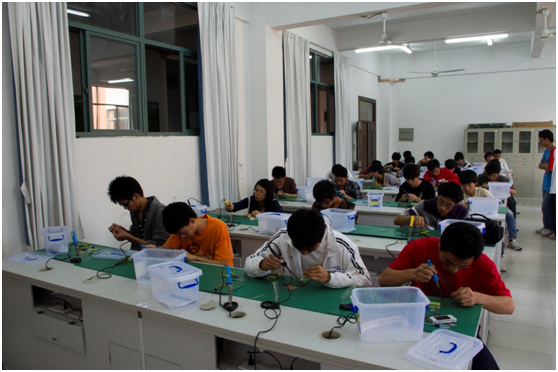 本实验室位于B2-301,占地面积约230m2,是供学生焊接练习、电子产品组装调试操作的实验室,能同时容纳120名学生进行实验操作。配备的仪器设备主要有直流稳压电源、示波器、万用表、交流毫伏表、实习工具箱等。为了改善实习室的空气环境卫生,还专门配备了抽风系统。主要承担《电子工艺实习A》和《电子工艺实习实习B》课程实践,可完成焊接练习、元器件检测、电路板焊接、调试、测量等等环节,使学生掌握手工电烙铁焊接技术与拆焊技术、元器件检测与识别、电路各种电路的设计方法,能按电路图接线和查线,进行实验数据的测量及整理,重点培养学生的动手能力,为学习后续课程及从事科学研究工作打下一定的基础。