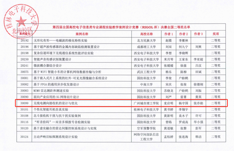 本网讯(记者 黄烁)11月5日,第四届全国高校电子信息类专业课程实验教学案例设计竞赛决赛(RIGOL杯)(以下简称“RIGOL杯”)在桂林电子科技大学北海校区落下帷幕。我校电子信息工程学院/通信工程学院共两支队伍参加比赛,麦启明、杨守国、张亦勋教师团队《无线电测向接收机的设计与优化》荣获中南赛区(初赛)二等奖,决赛全国二等奖的好成绩。丁汉、麦启明、杨守国教师团队《STP-网络中的“桥”:稳定性与效率的守护者》在中南...